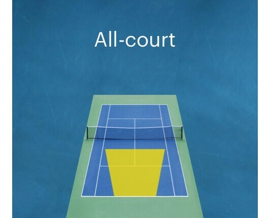 ALL-COURT is geschikt voor spelers die zich altijd over de tennisbaan bewegen en na de service naar het net gaan. Deze schoen is geschikt voor spelers die op zoek zijn naar een flexibele en duurzame schoen. Een voorbeeld van een all-court schoen is de Solution Speed FF 3.