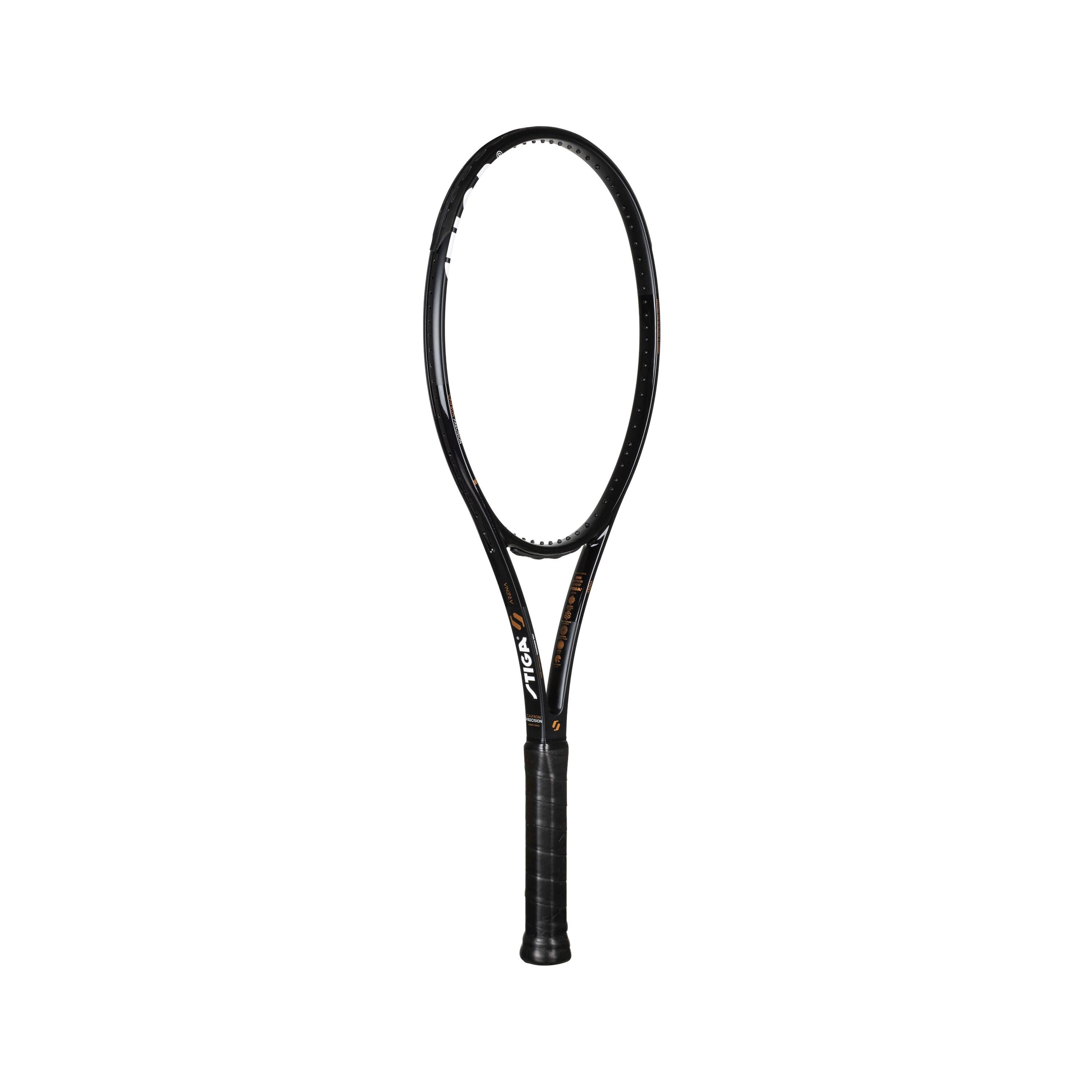 Tennisracket van Stiga in tijdloos zwart ontwerp en zachte speelervaring met het speciaal gemaakte, trillingsdempende handvat.